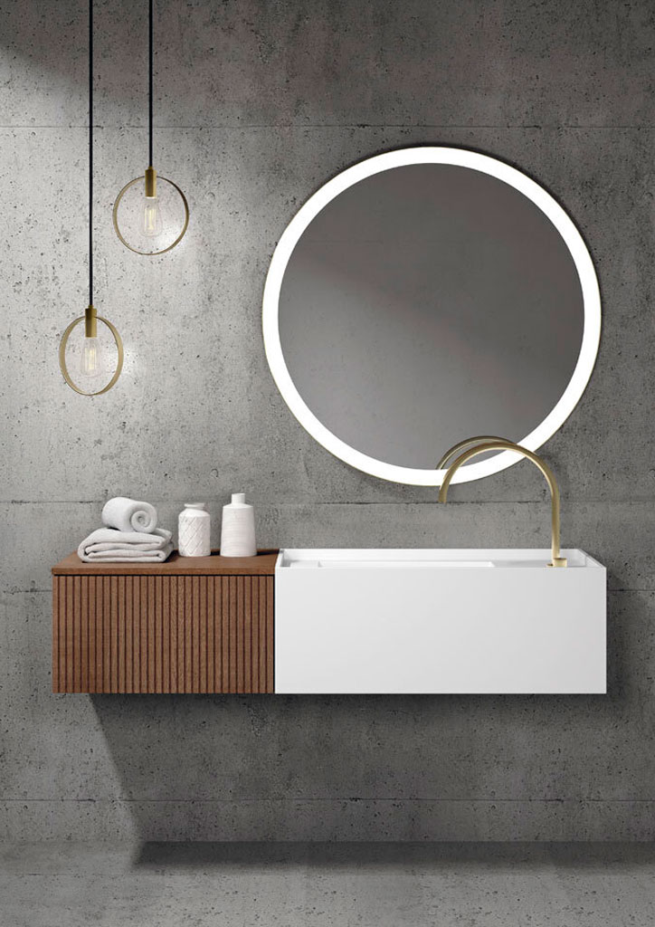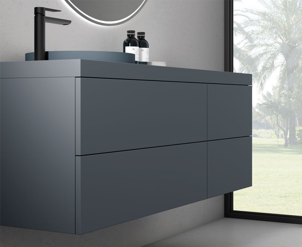 Harmony and elegance in the Fenix Bromo finish together with the new Pompei semi-recessed wash basin lacquered in select matt lacquer XG06.